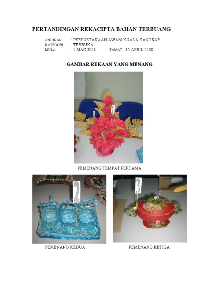 Rekacipta Dari Bahan Terbuang - Benda ini sangat rapuh dan mudah pecah.. Anjuran dari who seperti berikut, pengenceran 5 persen sodium hipoklorit dengan perbandingan 1:100 biasa dianjurkan. Documents similar to an rekacipta bahan terbuang. Ide dan peluang usaha kerajinan dari bahan limbah berbentuk bangun datar seorang wirausahawan harus dapat memanfaatkan peluang usaha secara rinci ada beberapa langkah yang perlu diperhatikan dalam menganalisis peluang usaha produk kerajinan dari bahan limbah berbentuk. Selain itu, juga bisa melatih anak kecil untuk berhemat dan menabung serta wawasan yang. Bahan yang lembut dan berbulu, dikembangkan di prancis.